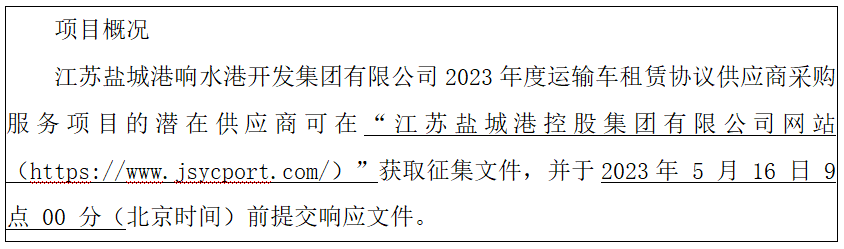 江蘇鹽城港響水港開發集團有限公司現就江蘇鹽城港響水港開發集團有限公司2023年度運輸車租賃協議供應商采購服務項目征集供應商,歡迎符合條件的供應商參加本次框架協議采購活動。